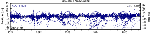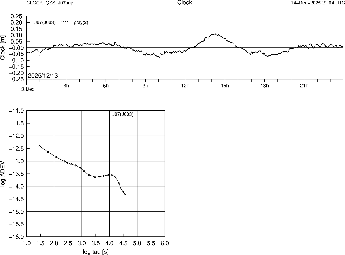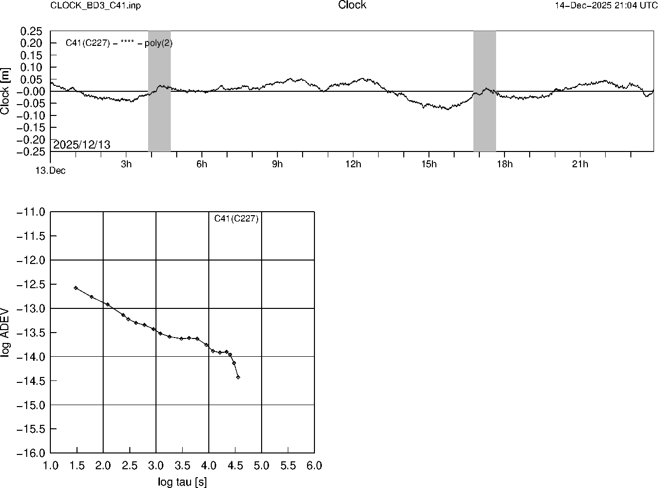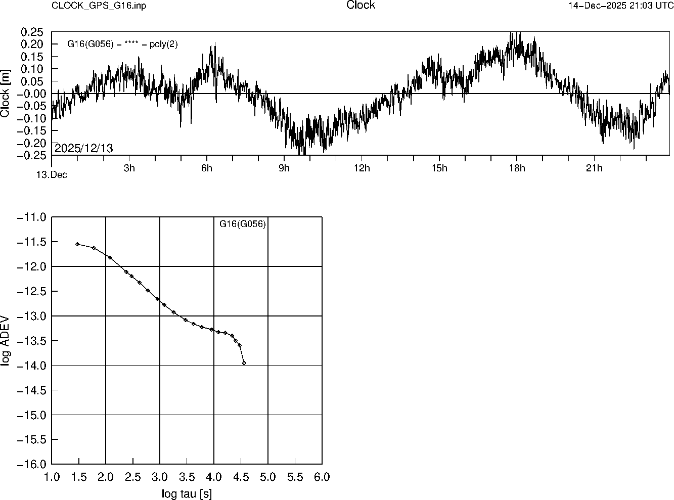The clock time series analysis is based on 30 s clock estimates of one selected analysis center (currently GFZ0MGXRAP). Time series after removing a 2nd order polynomial as well as Allan deviation plots are shown.