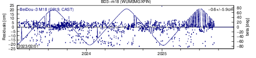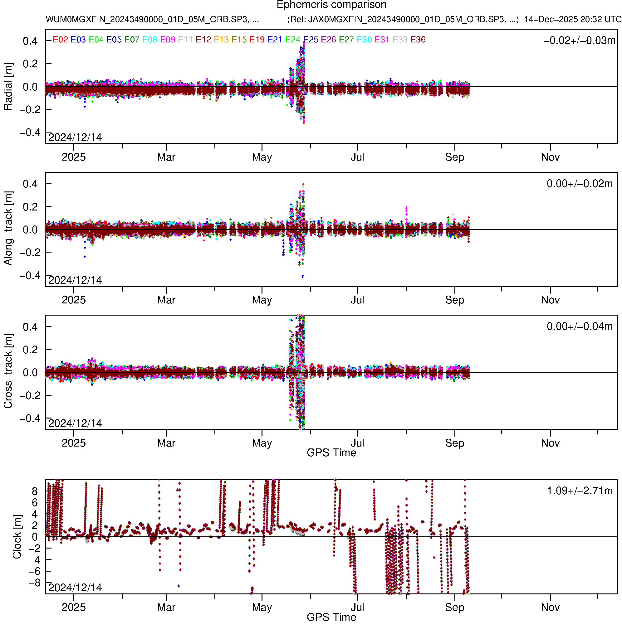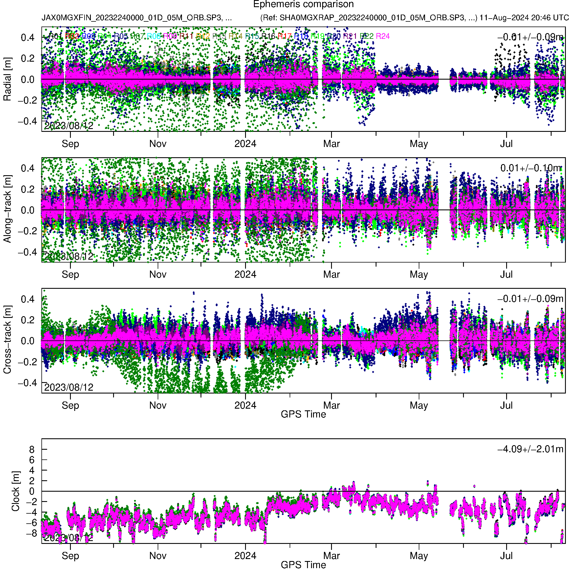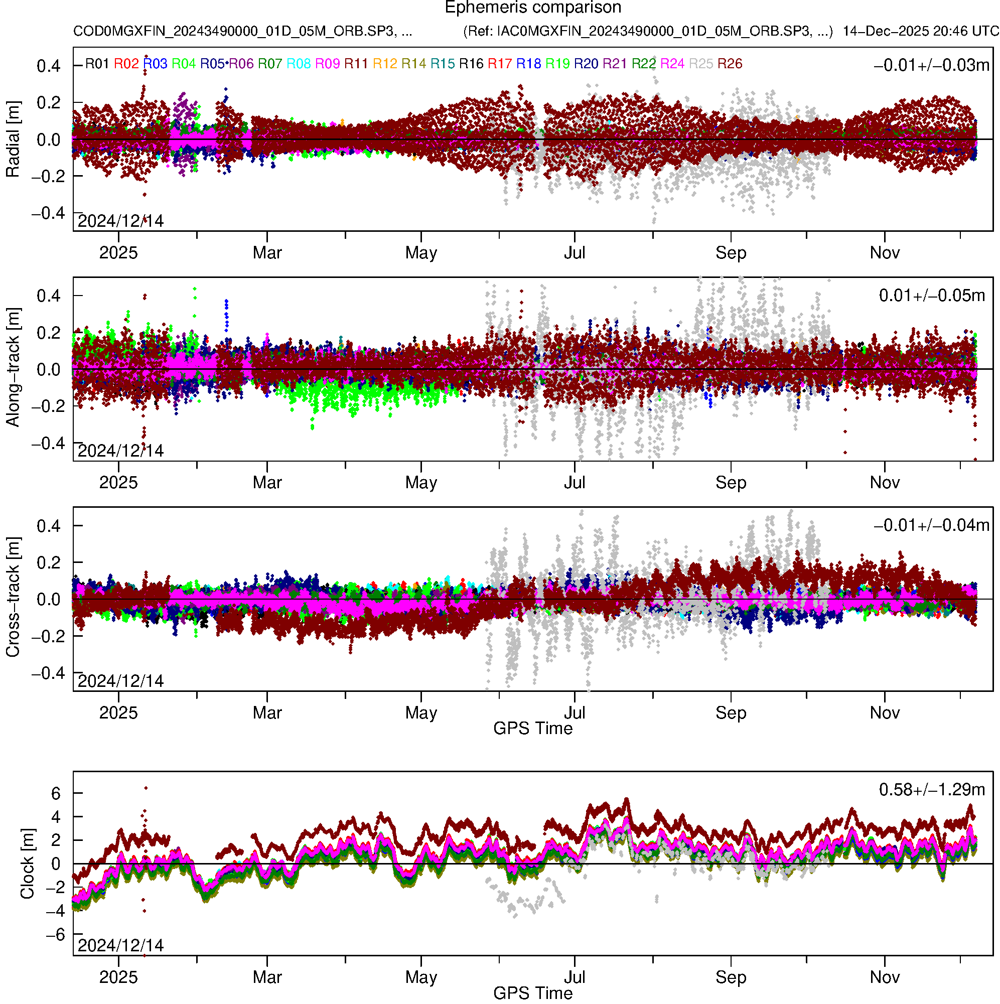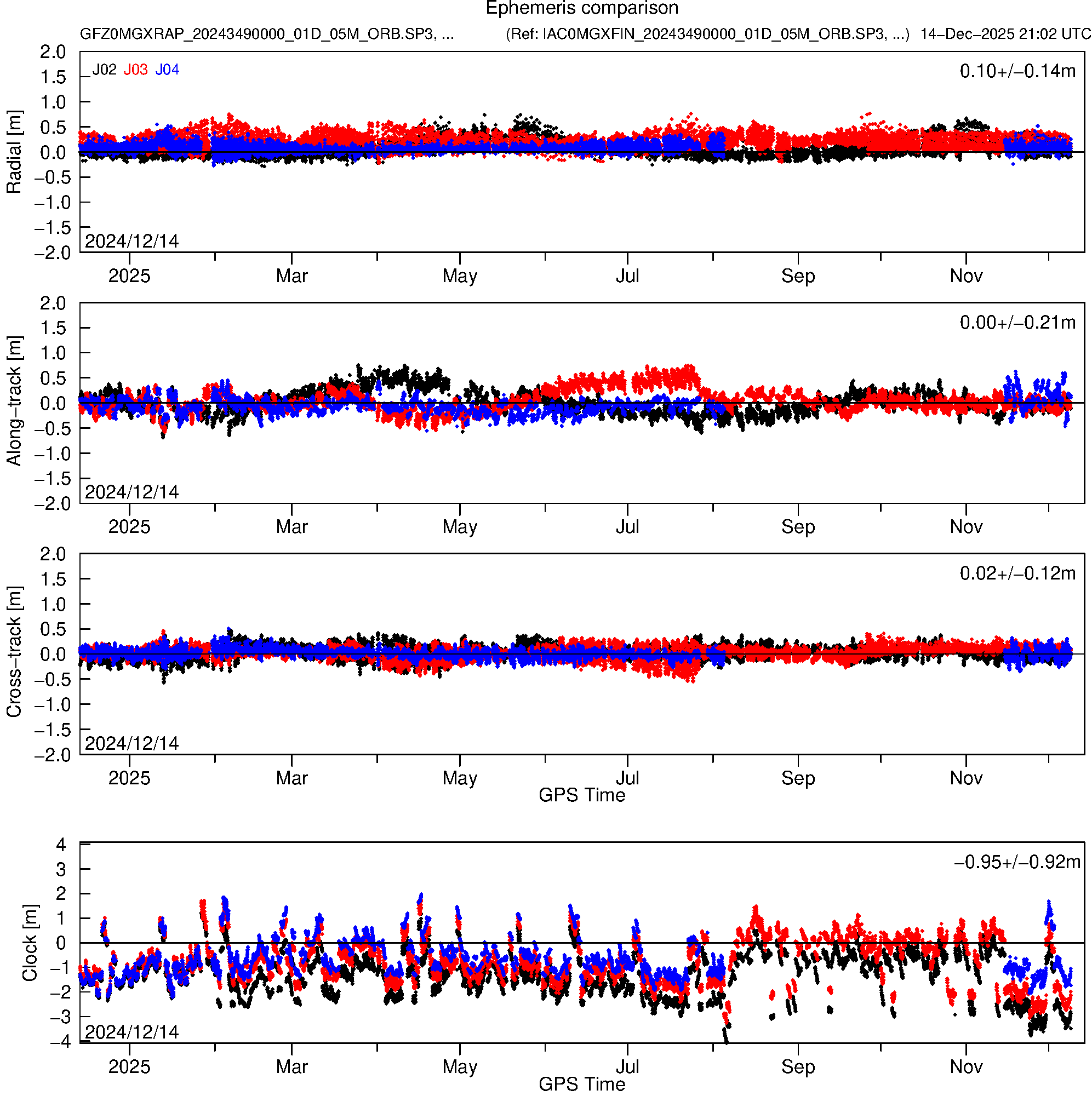 The differences of orbits and clocks for each pair of analysis centers and each constellation are shown in the following. Gross outliers exceeding 10 m are rejected. Bias and standard deviation of each component (radial, along-track, cross-track, clock) are given in the upper right of each subplot covering one year of data.